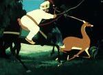 Son nom - Vijaya, qui signifie victoire - fait écho à l'arc éponyme que possède Karna dans le Mahâbhârata, grande Épopée indienne et texte fondateur de l'hindouisme. C'est aussi l'un des noms d'Arjuna, personnage central au sein de la Bhagavad-Gitâ, l'un des textes du Mahâbhârata. Arjuna et Karna, demi-frères, combattront l'un contre l'autre… C'est justement par une flèche que s'annonce la rencontre entre le jeune paysan et l'antilope. Vishnu, qui sous l'avatar de Krishna était le cocher du char d'Arjuna, est également le protecteur de la vache sacrée. Le bœuf étant présent également lors de la première rencontre, on a, en cette seule scène, une concentration de symboles pouvant être appréciés plus particulièrement par le public indien. Mais ces références mises ici en perspective, appuyées et interprétées comme telles, n'étaient peut-être pas volontaires de la part des concepteurs de cette œuvre