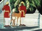 Dans la jungle indienne, le mahârâjâ et ses hommes chassent une antilope qu'ils parviennent presque à capturer. Mais dans sa fuite, sous une certaine impulsion de ses sauts mêlée au choc de ses sabots sur le sol, celle-ci laisse derrière elle, comme par magie, quelques pièces d'or. Ces dernières excitent encore un peu plus la détermination de ses poursuivants, mais lui permettent également sous l'effet de cette surprise, de les distancer un peu, les hommes ne pouvant s'empêcher de ramasser de suite la précieuse matière. A quelques arpents de terre plus loin, un jeune garçon qui, à l'aide d'un bœuf sacré, travaille la terre, perçoit au travers de la forêt cette agitation bruyante qui se rapproche, une flèche perdue allant même se ficher dans le bois de sa charrue. L'antilope arrive alors jusqu'à lui. Le jeune paysan admiratif de sa beauté, et comprenant rapidement la situation, lui permet de se cacher, et se débarrasse expressément des quelques pièces d'or que l'herbivore avait encore laissé derrière lui. Puis, il dit au mahârâjâ alors sur la piste du gracieux animal, qu'il a bien vu passé l'antilope, mais lui indique une fausse direction. Les pièces qu'il avait jeté un peu plus loin ayant été retrouvées par un serviteur du mahârâjâ, donneront un semblant de vérité à ses propos, et lui permettront d'éloigner la troupe humaine assoiffée d'or.