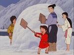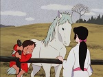 Néanmoins, en dehors de cette influence et d'une reconstitution très fidèle du Japon médiéval (la vie quotidienne des paysans est assez bien détaillée), le film cherche avant tout à proposer une histoire distrayante sans beaucoup s'attarder sur ses personnages ou encore sur le contexte historique. Ainsi, notre héroïne Yuki est un personnage gentil, pur et courageux, mais qui demeure peut-être un peu trop naïf pour donner un vrai poids à l'histoire. On s'attache davantage à la bande de petits mendiants, comme la jeune Hana, qui apportent une certaine fraîcheur et qui rappellent par ailleurs les jeunes enfants qui accompagnent Joe Yabuki dans Ashita no Joe, la série phare de Tetsuya Chiba (character-designer sur ce film). Alors que le film se voulait dans sa majeure partie réaliste (si l'on excepte la nature divine de Yuki), la dernière partie bascule soudainement dans l'absurde avec l'apparition du dieu maléfique de la montagne. Son design fait davantage penser à un robot géant qu'à un dieu terrifiant et le scénario expédie rapidement cette partie de l'histoire, sans expliquer les origines de ce dieu.