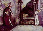Lire le synopsis completAussitôt, le calife essaye cette poudre en se changeant en poisson mais ne s’amuse guère dans l’eau car les autres espèces le rejettent. Il tente ensuite la transformation en araignée mais obtient le même résultat. Finalement, apercevant une cigogne voler dans le ciel, il décide d’adopter cette apparence-ci et part la rejoindre. Ensemble, les deux cigognes pensent du bon temps et c’est juste après s’être mis à rire que le calife se souvient – trop tard - de la mise en garde du voleur. Incapable de se souvenir de la formule qui lui rendra sa véritable apparence, le voilà condamné à errer hors du palais...