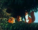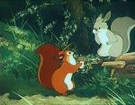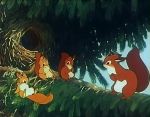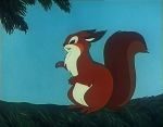 Lire le synopsis completPendant ce temps, Maman écureuil cherche en vain de la nourriture. Elle ne trouve au final qu'une pomme de pin vide qu'elle jette, désappointée, un peu plus loin, et qui retombe sur la tête d'un écureuil gris qu'elle n'avait pas vu, celui-ci se reposant derrière un tronc d'arbre. Cet autre rongeur qui est lui-même à la recherche de quelque nourriture, et n'ayant absolument rien trouvé tout comme elle, lui apprend hélas que la forêt semble ne plus pouvoir nourrir ses habitants. Toutefois, tout en discutant, Maman écureuil découvre un petit champignon encore consommable qu'elle est prête à partager avec l'écureuil gris qui ne l'avait point vu, et ce bien qu'il se reposait tout près de lui. C'est alors qu'un grand silence se fait dans la forêt. Des petites souris affolées et terrifiées arrivent près d'eux en courant et leur apprennent qu'une belette rode dans les parages. De suite, Maman écureuil se précipite dans la direction de ses enfants et les retrouve rapidement, si ce n'est Galopin qui n'est pas encore rentré et que l'on entend à ce moment-là, au loin, appeler au secours, ayant été pris en chasse par ladite belette. Heureusement, sa rapidité lui permet de retrouver son foyer, et Maman écureuil qui ne pouvait crier pour lui indiquer le chemin, pour ne point donner l'occasion à la belette de trouver son nid, se montre à celle-ci pour qu'elle l'a prenne en chasse et l'éloigner ainsi de son habitat. Finalement, malgré une légère blessure à l'une de ses pattes, elle parvient à rejoindre ses enfants, la belette ayant perdu sa trace...