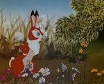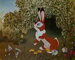Maman lapin, bienveillante, s'aperçoit évidemment que l'aîné de ses élèves est quelque peu dissipé et lui fait comprendre avec gentillesse que ce n'est pas bien puis, pour les récompenser de ces petits efforts, elle invite ses enfants à cueillir et déguster des fleurs de trèfle rouge. Mais alors qu'il s'apprête lui aussi à manger une délicieuse fleur, le regard du jeune lapin quelque peu distrait se porte un court instant sur un joli papillon et il ne voit pas au moment de croquer la plante qu'une grosse abeille s'est posée sur celle-ci. Le temps de l'étonnement passé et d'une étrange sensation vrombissante et de bourdonnement en bouche, il recrache l'insecte qui fort mécontent de cette mésaventure poursuit le petit lapin qui, fuyant à toute vitesse, finit sa course dans un jardin après s'être faufilé par un trou dans une clôture.