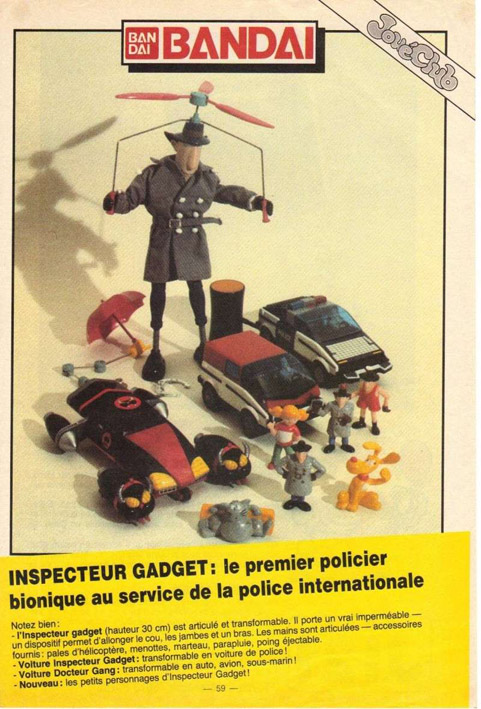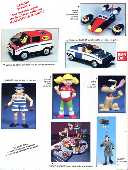 Bandai a distribué de superbes jouets sur la série, notamment la voiture de Gadget, la voiture du Dr Gang et un mannequin articulé équipé de gadgets de notre inspecteur gaffeur.<br>Voici une publicité d'époque parue dans les magazines publicitaires JouéClub.
