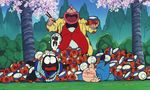 Deux nouveaux personnages, Yay Totani et Sandy Nakano, remplacent au début du film leurs cousins Yoshigai et Kazuo Nakano, les commentateurs habituels de la saga, dont ils sont les sosies en blond ! Mais ils passent vite à la trappe puisqu'ils sont changés en statue, comme la plupart des autres personnages.