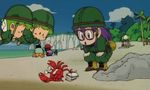 Un crabe géant sorti du fond des mers attrape un bateau pour le briser entre ses pinces ! Serait-ce une nouvelle menace qui va s'abattre sur le village Pingouin ? Non, en regardant mieux, il s'agit juste d'un petit crabe qui tient un bateau miniature et qui joue avec Arale sur la plage ! La fillette robot laisse même le crabe gagner au jeu du papier-feuille-ciseau... Plus tard, un autre danger semble arriver : on aperçoit près du rivage l'aileron d'un requin ! Suppaman, le super-héros (à la manque), s'élance pour le combattre mais il ne sert évidemment à rien puisqu'il ne sait pas nager ! Arale et Obocchaman vont voir de quoi il en retourne en plongeant dans la mer (ils savent nager eux !) En fait, un requin tourne autour de son petit qui s'est pris dans l'ancre d'un bateau et qui est prisonnier. Évidemment, Arale et Obocchaman vont à sa rescousse et le libèrent...