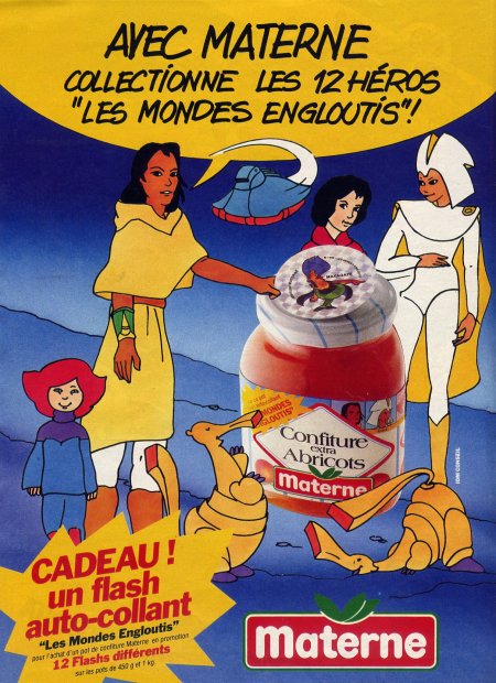 Publicité du Journal de Mickey 1769 (mai 1986). Sur les pots de confiture Materne, on pouvait avoir 1 des 12 autocollants ronds <i>(avec fond brillant)</i> des Mondes Engloutis.