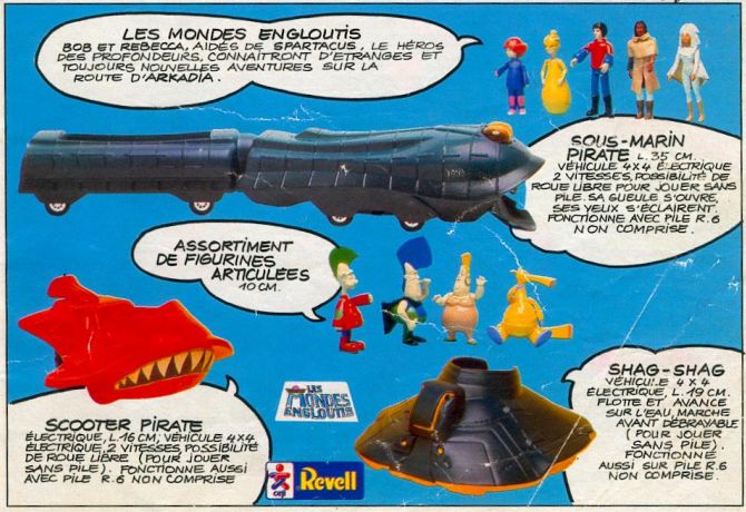 Une publicité JouéClub pour les Mondes Engloutis, parue en 1985. On y découvre tous les personnages et véhicules principaux de la série.<br>