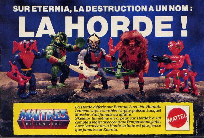 Issue du Journal de Mickey 1763 (avril 1986), cette publicité annonçait l'arrivée de Hordak et ses compagnons, les ennemis de... She-Ra. Mais à l'époque, ces jouets ont été intégrés à la gamme des Maîtres de l'Univers, et présentés comme des ennemis de Musclor...